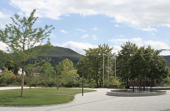 Neubau von Belags- und Vegetationsflächen im Zuge der Erneuerung der Abdichtung der Tiefgarage, Integration des bestehenden Brunnens.